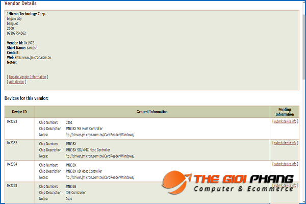 4. Nhấn vào tên hãng vendor website còn cho phép bạn biết 1 số thông tin về hãng này và website, nơi down driver (chỉ tham khảo thôi chứ thường phải google chính xác tên của thiết bị)