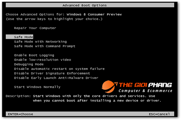 Laptop không khởi động được có thể do sự xung đột giữa các phần mềm hoặc trình điều khiển (driver). Do vậy bạn cần vào chế độ Safe Mode để gỡ bỏ những chương trình xung đột. Bạn có thể vào Windows bằng chế độ Safe Mode. Nhấn F8 sau khi khởi động, ở menu hiện ra bạn chọn Safe Mode.