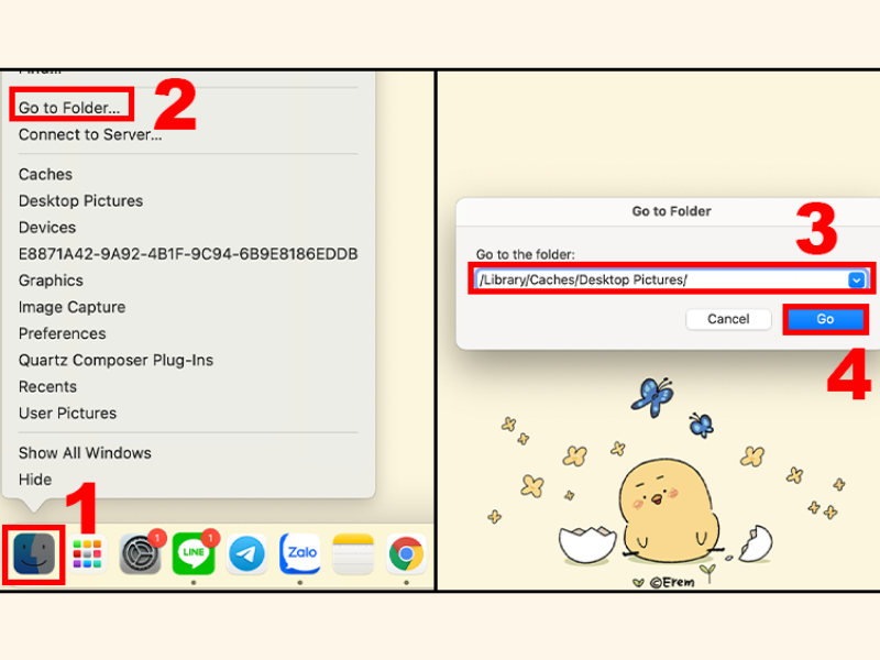 - Bước 4: Lần lượt chọn Finder > Go to Folder (hoặc tổ hợp phím Command + Shift + G) > Nhập cụm /Library/Caches/Desktop Pictures/ > Ấn vào Go > Chọn mục Folder.