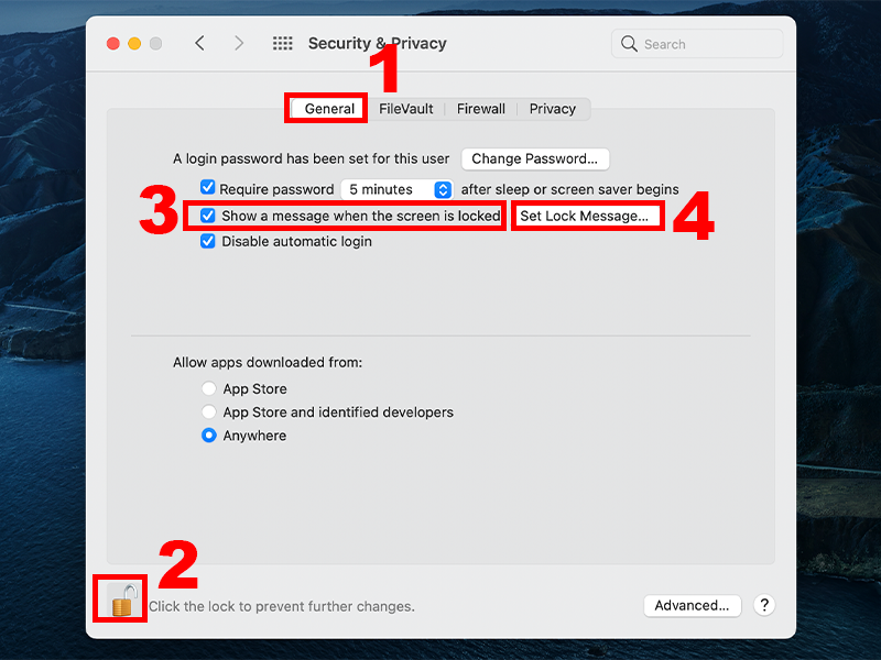 - Bước 2: Tiếp theo chọn General, lúc này sẽ yêu cầu nhập mật khẩu, hãy nhấn vào biểu tượng mở khóa và điền mật khẩu. Nhấn vào dòng Show the message when the screen is locked > Set Lock Message. Nhập văn bản bạn muốn hiển thị trên màn hình Macbook và nhấn OK để hoàn tất.